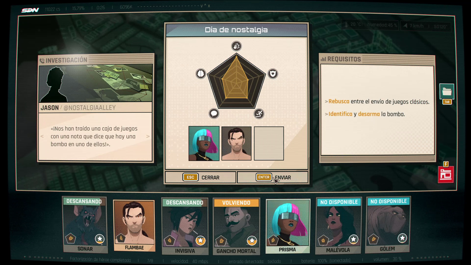 Para lograr esto, Dispatch te da lo que sería la “mecánica principal”. En lugar de explorar pequeñas zonas o llenar escenas de QTEs, la parte del gameplay es justamente despachar a tu equipo a las crisis que más se acomoden a las proficiencias de cada personaje. Como cada llamada que dice que se necesita hacer (tipo levantar algo pesado o convencer a alguien), se vuelve en un cierto puzzle de pensar quien es más útil. A mi parecer esta es mi parte favorita de todo el juego, se vuelve bastante satisfactorio ver como conoces más y más a tu equipo, haciendo que cuando logras reconocer quien sirve mejor en donde te sientas increíble.