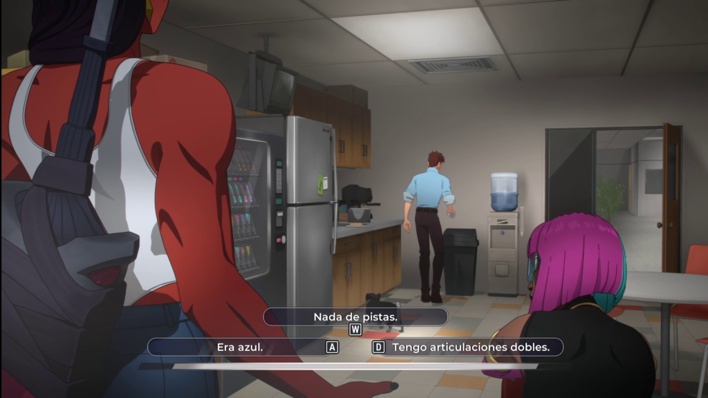Con respecto a la narrativa general, al igual que sus predecesores, usa arboles de dialogo para hacer que elijas que camino tomar, lo cual va alterando la percepción que tus compañeros tienen sobre ti e incluso puede afectar su rendimiento durante los despachos. Por desgracia, este apartado carga un poco de los mismos problemas que tuvo Telltale, y es lo poco profundo que llegan a ser estas “consecuencias”. Para ser un equipo de ex-villanos que claramente no quieren nada, son muy fáciles de convencer y conseguir el mejor final es tan fácil como “ser una buena persona”, lo cual tiene algo de sentido, pero cuando tienes personajes como Flambae o Prisma, hace que se sienta demasiado simple y más que un drama, se sienta como una sitcom.
